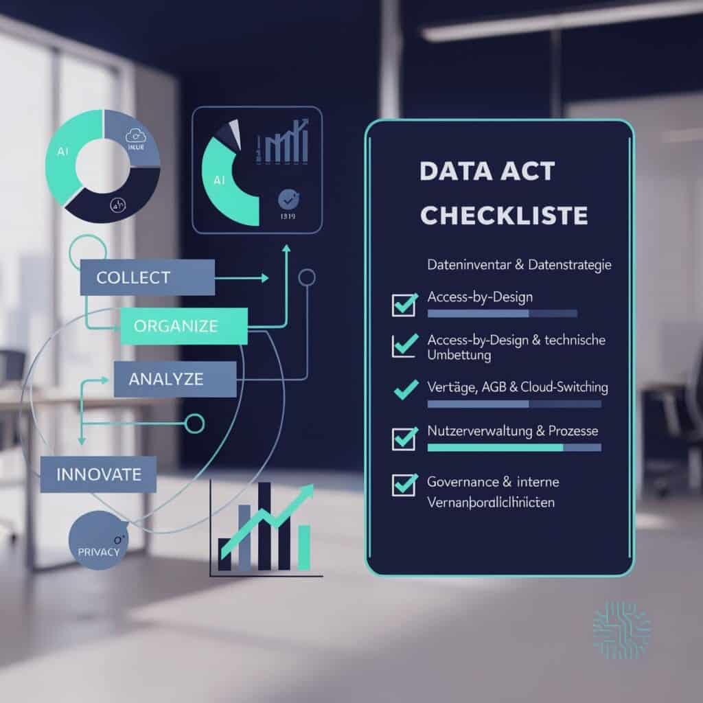 Alle vorgenannten Maßnahmen sind ohne klare interne Verantwortlichkeiten wirkungslos. Die Checkliste fordert: Management-Awareness herstellen, einen Data Act Compliance Officer oder SPOC benennen, ein funktionsübergreifendes Team etablieren, interne Leitlinien entwickeln und alle betroffenen Bereiche schulen – von IT und Produktentwicklung bis zu Vertrieb, Support und Recht.